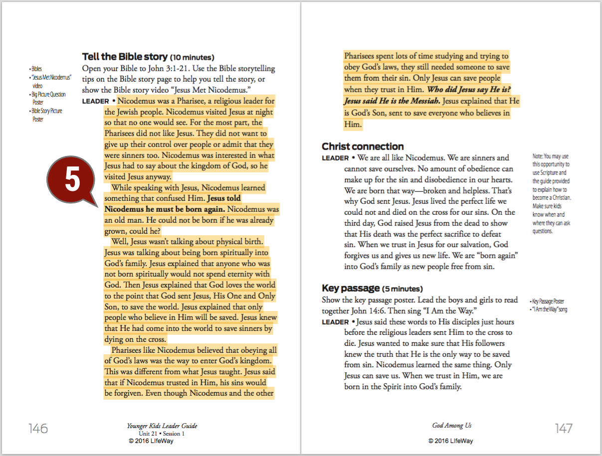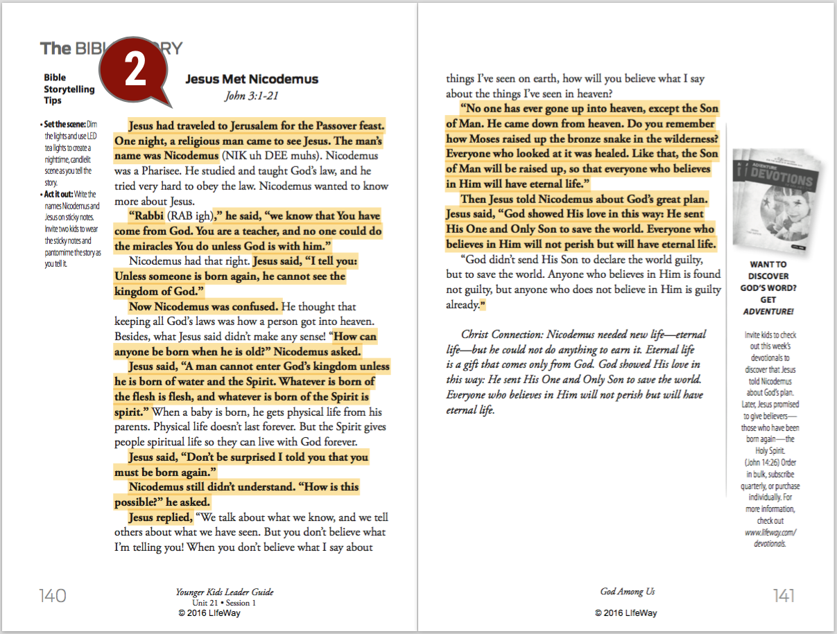 Read through the leader script coming out of the Bible story to get a feel for how you want to summarize the story and direct the kids toward the Christ Connection. Highlight the big ideas you want to share.