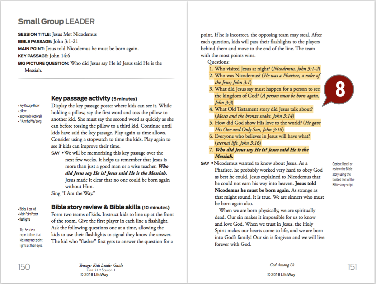 Start with the session’s title page and read the story’s Main Point, the Key Passage, and the Big Picture Question and Answer. You will reference these items during the session, and they also help you understand the general direction of the session. Take a few seconds and turn to the table of contents at the front of the leader guide and notice the sessions from the last few weeks to help you get a feel for the bigger story.