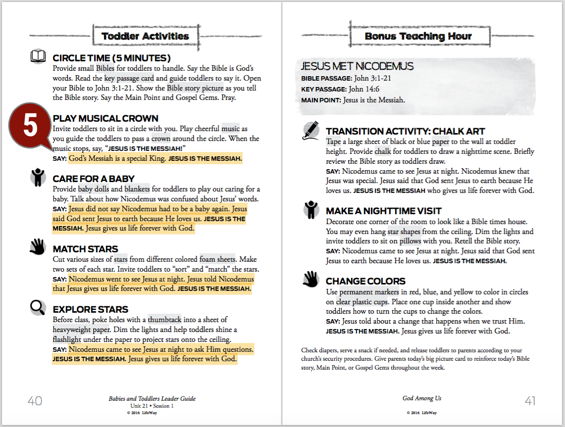 Finally, remember to be flexible. Some days, even if you have all week to prepare teaching babies or toddlers the Bible story, things can still be hit or miss if you, let’s say, have a room full of colicky six-months-olds. Or three-year-olds who are still having a hard time with separation anxiety. Pray, prepare for the session, and prepare to weave the Gospel Gems into the tried and true activities or procedures that will keep you afloat on the days where things don’t go as planned.