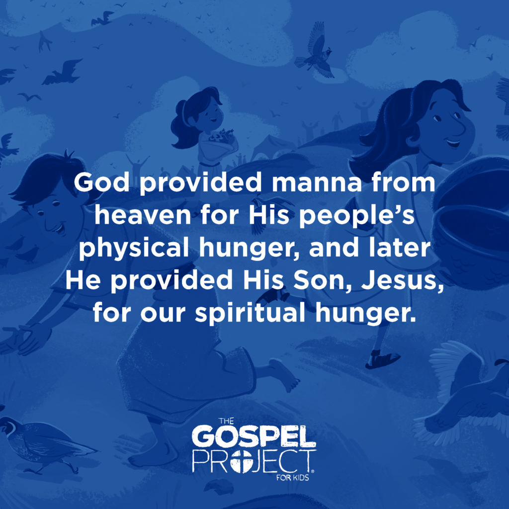 It was not accidental that God led His people into the wilderness. He knew they needed food to live. He wanted them to be in a place of desperation where only He could provide for them. The connection to Jesus’ words in John 6 is apparent. Just as God was the only way to satisfy His people’s physical hunger in the Exodus account, Jesus is the only way to satisfy our spiritual hunger. In Christ, and Christ alone, we find complete satisfaction. We’ve talked quite a bit about hunger to this point; it is time to talk about feasting instead. We have been invited to draw near to the table and feast on Christ any time we want and as much as we want. What a privilege we have been given! The satisfaction our souls long for is right there in front of us. In Christ, we never need to hunger. This is what we want our kids to see—that spending time each day in the Word, praying, and worshiping is not a chore, but rather a wonderful gift and blessing from God.Going through the wilderness was not necessary for Israel’s salvation, but it was necessary for their sanctification.”—Philip Graham Ryken [1]Preschool Tip: For preschoolers, the big idea to convey is that God loves us and provides for us. This is a critical building block for them to understand that God provided Jesus for us. This session also might offer you the opportunity to talk about why many Christians pray before meals. Praying for our food is one way we can remember to thank God for all of His provision in our lives. Kids Tip: As you drive toward application this week, consider encouraging your kids to skip a meal. Fasting is generally not recommended for children because of physical concerns, but skipping one meal, with parental permission of course, is a way that your kids can stretch themselves and experience a deeper feeling of hunger than they normally might. If you do suggest this, be sure they understand what fasting is and that they do not boast if they fast a meal. [1] Philip Graham Ryken, Exodus: Saved for God’s Glory, in Preaching the Word (Wheaton: Crossway, 2005), 414. https://vimeo.com/292203497